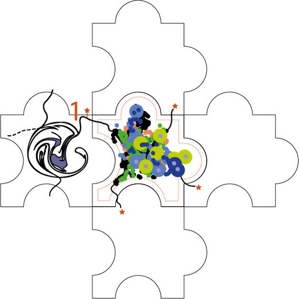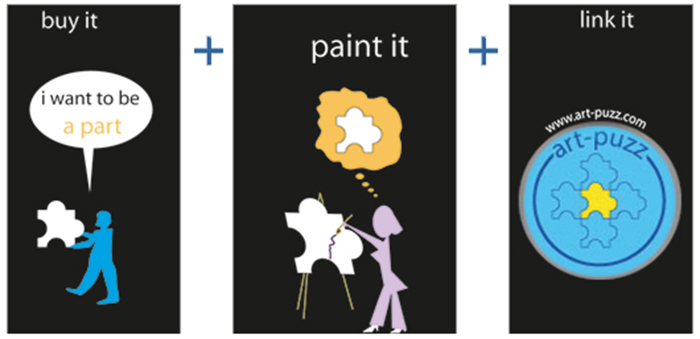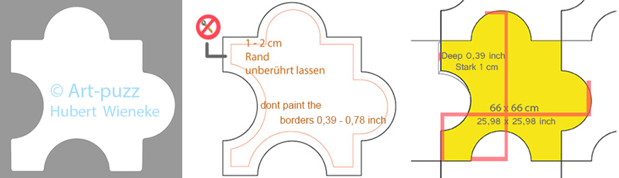 Wer kann teilnehmen? Da dieses Kunstprojekt eine gewisse Qualität anstrebt, ist die völlige Offenheit leider nicht machbar und sinnvoll. Daher bitte ich um Verständnis, das nicht jeder, der Hobbymässig kreativ ist, hier automatisch teilhaben kann. Erwünscht sind Teilnehmer, die schon eine gewisse Erfahrung oder ein künstlerisches Renomee vorweisen können, aber auch gern vielversprechende Anfangstalente, was vorab zu belegen ist, akzeptiert werden JPG und PDF Formate. Grafiker, Illustratoren, Maler und Artverwandte Künstler sind herzlich eingeladen. Der Einführungsbeitrag* von 175,- € ist einmalig und vorab zu zahlen. Er deckt u.a. die externen Kosten wie Herstellung per CNC-Fräse, Fotostudio, Versand an den Teilnehmer sowie interne; Verwaltung und Aufnahme in die Onlinegalerie, Marketing. Die Rücksendung an Art-Puzz zahlt das Mitglied, bitte UPS inklusive Retourschein nutzen, da dort die Haftungs-Deckung ausreichend hoch ist. Zusätzliche Lieferkosten außerhalb der EU sind nicht gedeckt. Warum teilnehmen? Gute Frage, kurz gesagt; das charmante Novum an diesem -endlosen- Kunstprojekt namens Art-Puzz ist die eine Union aus altem Handwerk und neuen Medien. Letztere bieten heutzutage bessere Möglichkeiten, um weiträumig bekannt zu werden. Auch das Dabeisein sollte schon motivieren, denn immerhin bilden wir gemeinsam ein völlig neues Kunstwerk, on UND offline, das zum Sammeln animieren soll. Der Ablauf. 1. Der geneigte und anerkannte Teilnehmer erwirbt ein Puzzleteil! Material: beidseitig weissbeschichtete MDF (Holzfaser)-Platte, Maße: (66 cm B/L,1 cm T) Das wurde vorher schon von einem oder mehreren Rändern mit schwarzen Linien bemalt (bis 2 cm), die es fortzuführen gilt, als Übergang für die angrenzenden Teile, womit auch gleichzeitig ein Kopierschutz generiert wird. Auf dem Puzzletypischen Übergang beruht gleichzeitig eine wichtige Design-Regel; Der Gestaltende darf nicht ganz bis an die Ränder malen, sondern soll da eine Zone von mindestens 1 cm frei lassen! Ausnahme; Je eine schwarze Kontakt-Linie an der noch nicht damit versehenen Seite, soll aus den Rändern aus Ihrem Teil wachsen, und darf und muss ausnahmsweise an den Rand gehen, um auf jeder Folge-Seite den Übergang zu ermöglichen (siehe 1*). Auch hier gilt, nicht stärker als 1 - max 2 cm, die Form ist frei. ![]() 2. Wenn Sie diese kleine Auflage akzeptieren, packen Sie die Malmittel aus und legen Sie los. Leider geht es nicht ganz ohne diese Regeln, aber gestalterisch sind es ja nur diese beiden, der Inhalt und die Aussage des Bilds im Puzzle-Teil ist völlig dem Kreativen überlassen, ob er nun selbst Hand anlegt oder es als Auftraggeber anderen überlässt. Falls Sie also nicht selber malen können oder wollen, kann das auch delegiert werden. Also, auf gehts. ![]() 3. Nach der Fertigstellung IHRES TEILS senden Sie es zurück, damit;